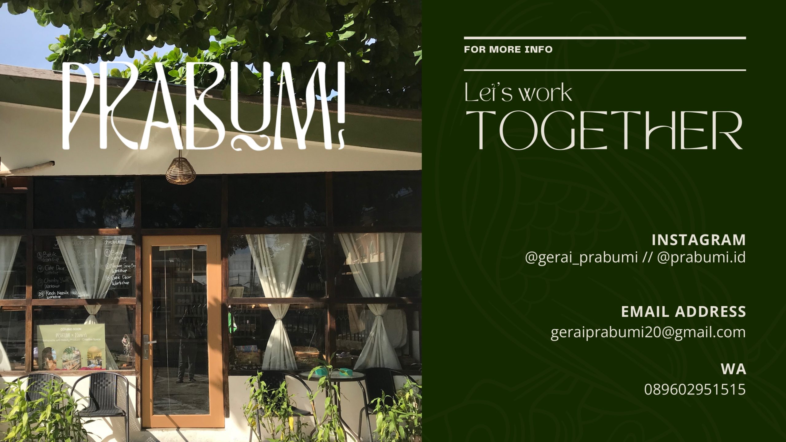 Gerai Prabumi adalah ruang kreatif yang berfokus pada produk handmade dan gaya hidup berkelanjutan.Kami percaya bahwa setiap karya buatan tangan memiliki cerita dan nilai tersendiri tidak hanya indah, tetapi juga bermakna.
